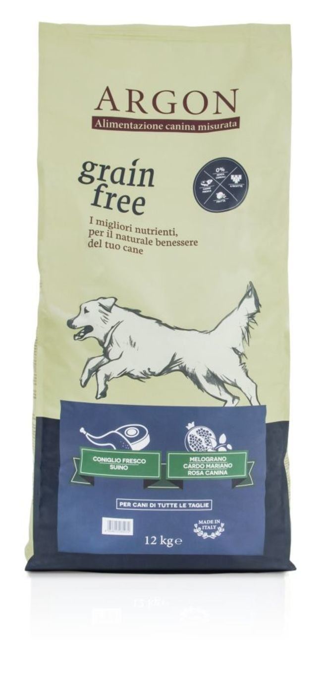 Argon Grain Free è una linea di mangimi Italiani per cani di altissima qualità, studiata per offrire al cane adulto una combinazione di nutrienti completamente bilanciata, ricca e completamente priva di cereali.