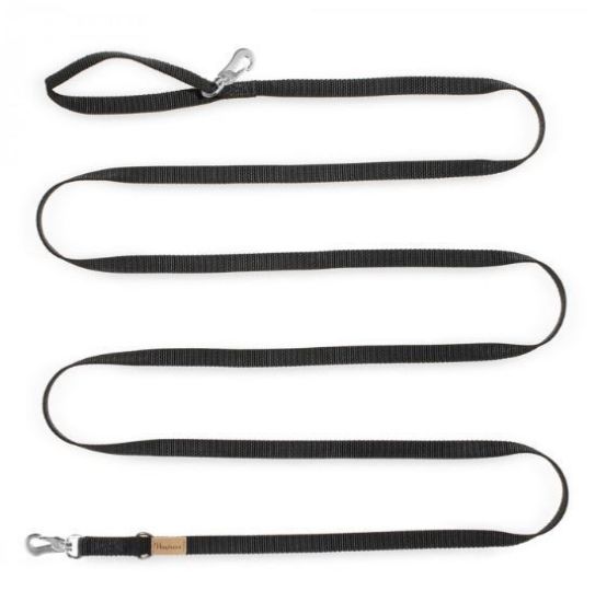 Guinzaglio di lunghezza variabile (da 1,5 a 10 metri) prodotto con nastro in poliammide ad alta tenacità, tinto in pasta e larghezza variabile (15mm o 20mm) in base alla misura.