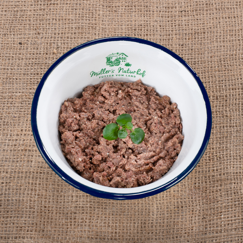 Manzo 35% (cuori di manzo, manzo, fegatini di manzo, polmoni di manzo), anatra 35% (cuori di anatra, fegatini di anatra, colli di anatra), brodo 25,7%, patate 3%, sostanze minerali 1%, olio di lino 0,2%, prezzemolo 0,1%