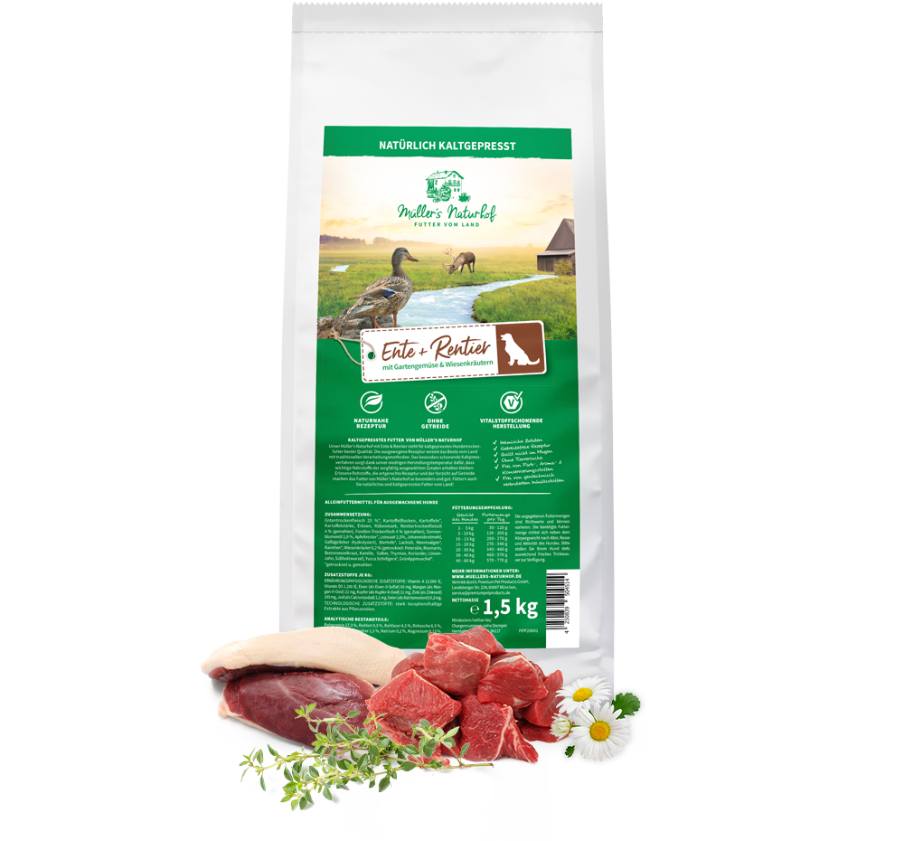 Il tuo cane ha bisogno di varietà nella ciotola del cibo? Allora il mangime pressato a freddo anatra e renna Müller's Naturhof è quello che fa per voi. La carne di renna è usata raramente, ma è molto nutriente in quanto contiene molti acidi grassi insaturi, simili a quelli del pesce.