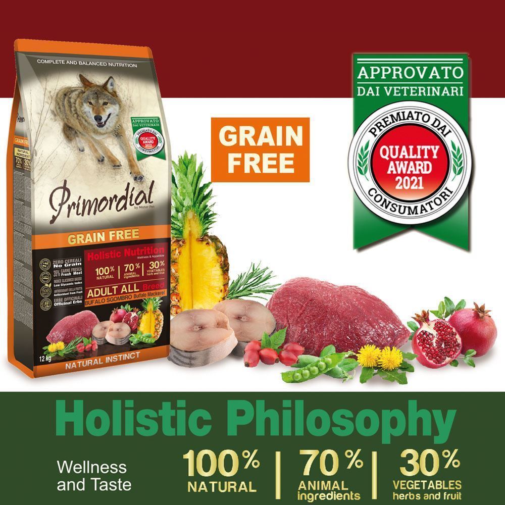 Primordial grain free bufalo e sgombro è un alimento completo e bilanciato senza cereali molto digeribile, con proteine non convenzionali, risulta essere a basso rischio allergenizzante, ma con alto valore biologico.