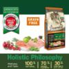 salmone fresco (35%) carne di pollo disidratata (24%), piselli, patate, grasso di pollo (11 %), fagioli, semi di lino (2%), polpa di barbabietola, lievito, alghe in polvere (0,3%), oligofruttosio (0,2%), prodotti di lievito (0,2%), Yucca schidigera (0 03%), cardo mariano (Silybum marianum L.) (0,02%), melograno disidratato (Punica granatum) (0,02%), mela disidratata (Malus pumila) (0,02%)rosa canina frutto disidratato( Rosa Canina LR, pendulina L.) (0.002), more disidratate (Rubus ulmifolius Schott) (0,0006%), glucosamina, condroitina solfato, estratto di rosmarino.