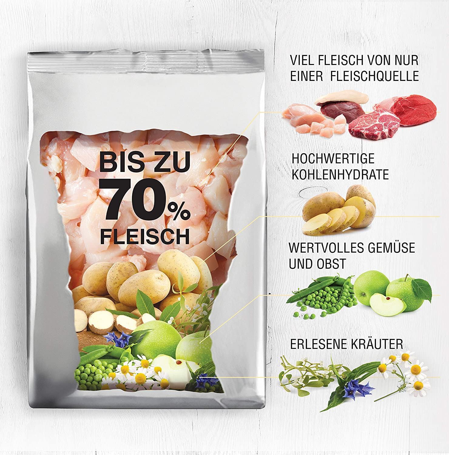 Con oltre il 70% di carne di anatra proveniente dalla produzione alimentare, ingredienti selezionati come patate e piselli e molte erbe preziose, il nostro cibo per cani semi-umido di alta qualità contiene tutto ciò che è necessario per una dieta appropriata e sana per la specie.