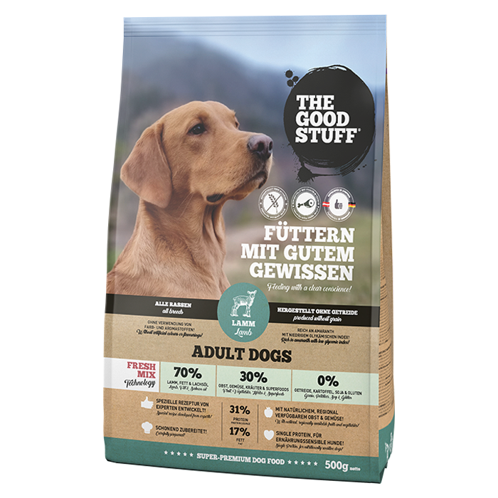 THE GOODSTUFF è un mangime completo ideale per cani di tutte le razze e taglie. Prodotto accuratamente senza cereali, ricco di muscolo di manzo fresco di qualità alimentare, amaranto a basso indice glicemico, frutta e verdura regionale ed erbe selezionate.