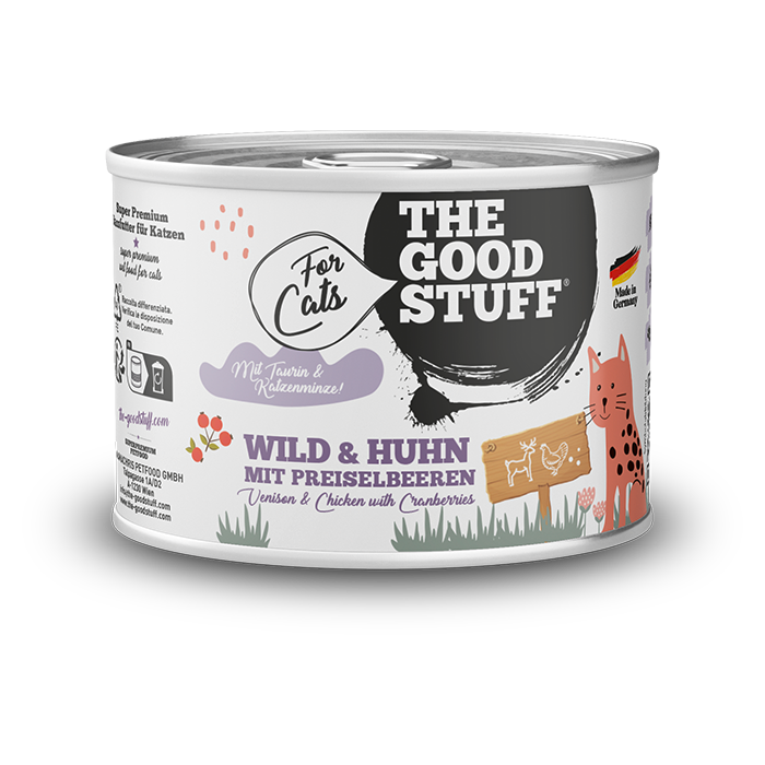 Cervo e Pollo con Mirtilli Rossi è un alimento umido senza cereali di comprovata qualità super premium di THE GOODSTUFF For Cats. L'elevata accettanza di THE GOODSTUFF For Cats è il risultato dell'utilizzo di materie prime di altissima qualità: il cervo e il pollo magri, particolarmente saporiti e a basso contenuto di grassi, sono altamente digeribili e ricchi di preziose vitamine e nutrienti. Il nostro alimento umido per gatti è cotto delicatamente, contiene il 40% di carne fresca di muscolo di pollo e frattaglie di alta qualità provenienti da fornitori regionali, il 26% di selvaggina fresca e raffinato con verdure, taurina ed erba gatta disponibili a livello regionale.