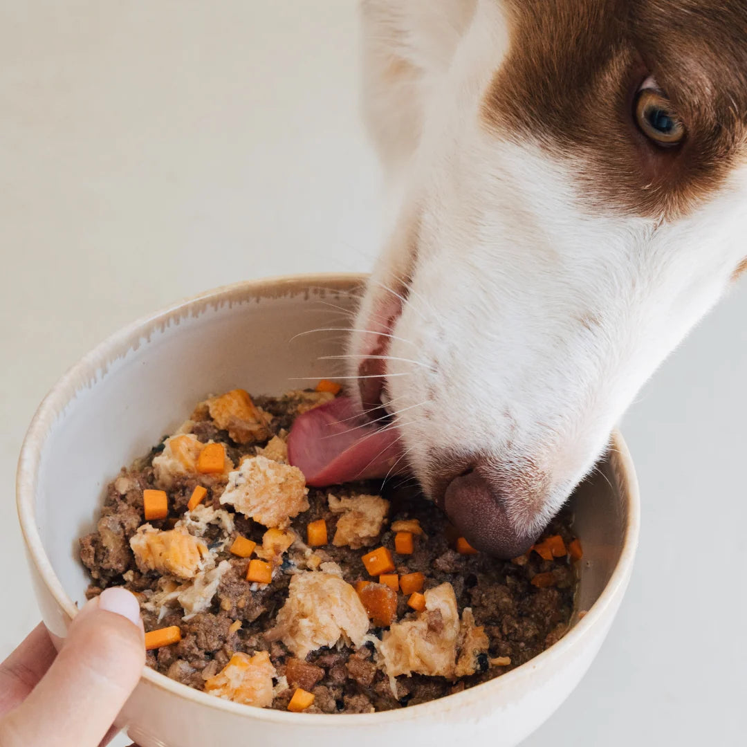 60% manzo fresco (30% manzo macinato, 10% midollo di manzo, 10% cuore di manzo, 5% fegato di manzo, 5% rene di manzo), 30% salmone fresco, 7% carote e 3% spinaci.